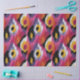 Papel de tecido de dissociação com um padrão uniforme de formas orgânicas no estilo ikat. As cores proeminentes são cor-de-rosa, roxo, preto, branco, laranja e amarelo-ouro.