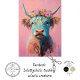 Vaca do planalto com uma coroa de flores, colocada sobre um fundo rosa. O cabelo comprido e assombroso da vaca é transformado em tons vibrantes de azul, laranja e branco, criando um retrato branco e colorido. A expressão tranquila e neutra da vaca acrescenta à atmosfera serena e charmosa da trabalho de arte. Esta peça combina lindamente elementos de encanto rústico com talento artístico, fazer-a uma adição deliciosa a qualquer coleção