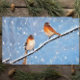 Design de papel de tecido sazonal com dois pássaros em um galho num dia de inverno nevado.