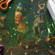 Antigo estatuto egípcio num fundo verde estrelado. Tutankhumen, Nefertiti, Bastet, Anubis e Esfingx.