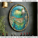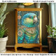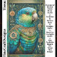 A richly detailed parrot portrait of a bright blue and green bird adorned in ornate steampunk accessories. The parrot’s feathers transition from aqua to emerald and deep teal. Around its neck rests an elaborate metallic collar set with embellishments, blending natural beauty with intricate mechanical design. Surrounding the bird is a coordinating background of scrollwork and stylized medallions, all in gold tones. Artwork similar to a digitally painted fantasy illustration…..COLOR COMBINATIONS: Teal, turquoise, emerald green, brass, ochre, and navy…..PERFECT FOR: