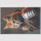 O gato guerreiro é retratado com uma postura majestosa, seu pelo moldado em tons negros de laranja, branco e preto. Os seus intensos olhos verdes transmitem um sentido de determinação e coragem. Adorcido em armadura detalhada que inclui couro e elementos metálicos, o gato está preparado para qualquer desafio. O fundo escuro com iluminação sutil destaca as características do gato, enfatizando sua prontidão para a batalha.
