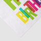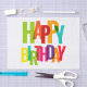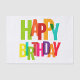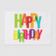Um design gráfico colorido com as palavras "FELIZ ANIVERSÁRIO" empilhadas umas sobre as outras. A palavra "FELIZ" está no topo, e "BIRTHDAY" está no fim. Cada letra tem uma cor diferente, incluindo verde, vermelho, laranja, amarelo, ciano, magenta e roxo. As letras são ligeiramente transparentes, fazendo com que as cores se misturem onde se sobrepõem. O fundo é branco plano com textura sutil. O estilo geral é moderno e alegre.