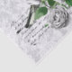 Uma bela colagem de um pássaro, rosas brancas e escrita sobre um fundo de damasco cinza.