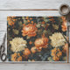 Papel de tecido floral, inspirado no legante vintage, com flores em laranja e marfim a negrito sobre fundo preto rico. Perfeito para embrulhar presentes, artesanato, dissociação ou adicionar um toque de charme de outono a favoritos para festas e projetos sazonais. Uma bela escolha para o outono, Dia das Bruxas, ou comemorações de Ação de Graças.