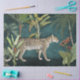 Teal Blue, design do estilo Vintage Safari tem um Leopardo perseguindo na selva de florestas tropicais com flores vermelhas, palmeiras e bananeiras verde e design de folhagem com escrita manual, letras escritas à mão e seals efêmeras que foram desenhadas graficamente por uma artista e designer internacionalmente licenciada, Audrey Jeanne Roberts, copyright.