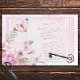 Lindos, cor-de-água, florais em um papel rosa bordado com letra de mão vintage. Além disso, uma borboleta cor-de-rosa e uma chave esquelética sob joia.