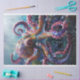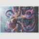 Um polvo muito branco, detalhado e colorido num cenário submarino. O polvo apresenta uma pele de textura rica com vários padrões, incluindo círculos e espirais, em tons de laranja, roxo, azul e rosa. Bolhas cercam o polvo, melhorando a atmosfera submarina. Os detalhes intrincados e cores vívidas dão vida a esta criatura marinha, destacando a textura dinâmica e o ambiente vivo que ela habita.
