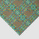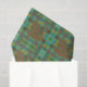 Uma silhueta estilizada de um cisne castanho é colocada contra um padrão geométrico intrincado e multicolorido. O fundo apresenta uma vibrante mistura de tons turquesas, amarelos e castanhos, criando um efeito visualmente texturizado.
