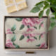 Este item apresenta um design chique com jardinas cor-de-rosa, folhas verdes e um fundo macio e brando.