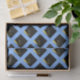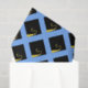 Tecido decorativo de decoração de presentes e formandos de graduação criativa com padrão de boné de formatura preto e de ouro sobre fundo azul-claro.