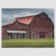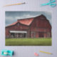 Grande celeiro vermelho sob nuvens escuras e tempestuosas.