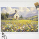 Uma pintura digital charmosa de uma igreja quintal aninhada em um campo vibrante de flores silvestres. A igreja, com o seu rolo clássico e muros lavados em branco, mantém-se graciosamente contra um céu suave e sonhador. O primeiro plano está a rebentar com flores silvestres coloridas em tons de amarelo, roxo e rosa, balançando suavemente na brisa. A luz do sol filtra através da cena, lançando um brilho quente e pacífico, evocando uma sensação de serenidade e beleza eterno.