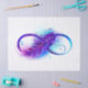 Símbolo infinito com uma bela pena pintada em cores roxas e azuis brilhantes sobre fundo branco.