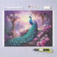 Em um jardim vibrante com flores de fuchsia, um pavão elegante exibe sua espantosa plumagem. Cada pena cai em tons de esmeralda e safira, contrastando lindamente com o rico pano de fundo floral. Esta criatura regal encarna a graça e a beleza, convidando-o a percorrer um reino onde a arte da natureza toma o palco central.