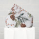 Um papel de tecidos de férias com um buquê pintado a aquarelas, cones de pínus e ramos de árvores de zimbro, pintado a aquarelas, com um padrão repetido.