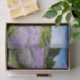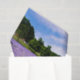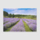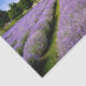 Campos lavendares roxos numa fazenda com colinas rolantes e fundo florestal
