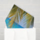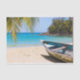 Papel tecidular com uma cena de praia tropical idílica. Água clara de cristal azul turquesa e uma praia arenosa castanha macia. Algumas folhas de palma penduradas de cima. Um velho barco a remo de madeira fica sentado na praia. Uma paisagem serena e pacífica.