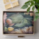 Papel tecidular com retrato de felino, cor d'água, apresentando um jovem leão com olhos verdes olhando para frente em um ambiente botânico exuberante com abundantes flores de pêssego. Excelente para grandes amantes de gatos, Leos zodíacos e chás de fraldas de safari ou de matas, etc!