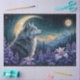 Lobo sentado sob uma lua crescente com flores roxas ao redor de AI Arte gerada por minx267