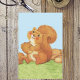Esta imagem de vintage tem um esquilo marrom doce e giro sentado na grama com um céu azul atrás dele. Ele está segurando uma bolota e está cercado por mais bolotas e loucos. Ele está lambendo seus lábios antecipando sua deliciosa refeição de loucos. Veja minha loja Art by MAR para combinar produtos com este design.