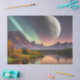 Lua pendurada sobre a paisagem montanhosa com Aurora Borealis refletida na água Autumn tree AI Art criada por minx267