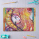 Colorida, branca, única, pintura artística de aquarela, Misteriosa e espumante máscara de mascarada veneziana, com belas rosas vermelhas e espirais florais, floresce uma planta de borboletas mágicas em brilhos de ouro, em amarelo roxo de fuchsia, cor violeta, verde iridescente, ouro e prata, inspirada no Carnaval de Veneza pela Búlgara Lumini (c)