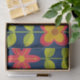 Este é um belo padrão geométrico vermelho de flores em ramos longos com folhas verdes sobre fundo azul escuro.
