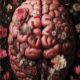 Uma mistura assombrosa de anatomia cerebral, com flores de noz tecendo através de delicadas vias neurais. Pinks escuros, verdes profundos e negros de tinta formam uma paleta de sonho. Sugestões de carvão branco e escuro ao longo do fundo, sussurrando o conhecimento esquecido de Memento Mori.