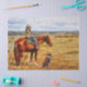 Uma jovem vaqueira espera que seu pai se recupere para que comecem a arredondá-lo. O seu verdadeiro cão de vaca senta-se ansiosamente a observar o rebanho à distância enquanto o cavalo aproveita esta oportunidade para deitar. Trabalho de arte realista criada de uma pintura original de óleo pelo artista equino e da fauna selvagem Crista S. Forest.