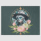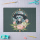Mulher espantosa adorada com uma espantosa maquiagem do crânio de açúcar. As cores brilhantes e os intrincados padrões contam histórias de vida e morte, dando a ela um olhar alegre, mas respeitoso, que é perfeito para Día de los Muertos. Seu cabelo longo e fluente brilha uma brilhante turquesa que flui sobre seus ombros como uma cachoeira de cor. Ele pega a luz e melhora o humor festivo do design. O fundo brilha em azuis profundos e verdes, lembrando um céu noturno, enquanto flores delicadas, rosa e brancas, dançam ao seu redor. Estes sotaques florais não só adicionam cor, como também simbolizam o amor e a memória do falecido.