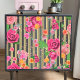 design de papel para tecidos florais rico com rosas em fundo listrado vertical a ouro e a preto.