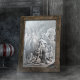 Ilustração gravada de Gustave Dore, The Raven ca 1883, mostrando o poeta cercado por anjos e esqueleto.