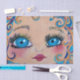 Pintura de rosto de boneca de uma garota com grandes olhos azuis