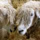 Duas lindas ovelhas Cotswold capturadas fotograficamente em um momento engraçado e humorístico conversando entre si. Os ovinos de coalhada são originários dos Cotswolds, na Inglaterra, e são criados para a sua lã e carne. Eles têm pulgas longas com quase ouro de tonalidade.