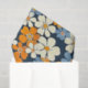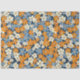 Um padrão floral vibrante cobrir toda a imagem. Flores pequenas e estilizadas em tons de laranja, azul claro e esbranquiçado são dispostas densamente sobre um fundo azul marinho. As flores têm um aspecto ligeiramente imperfeito, pareceria, com variações na saturação e forma das cores que dão ao padrão um aspecto texturizado, quase pintado à mão. O padrão repetido cria um efeito visual alegre e ocupado.