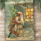 Encantadora ilustração vitoriana do cartão de Natal, com o velho mundo Padre Natal andando pela neve trazendo brinquedos e uma árvore para crianças numa casa acolhedora.