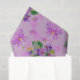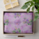 Um bonito papel floral, cor-de-rosa e púrpura, que inclui cachos de pequenas pansias azuis e púrpuras espalhados sobre um fundo cor-de-rosa. Há também menores violetas cor-de-rosa ao seu redor.