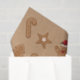 Ilustrações originais do biscoito de gengibre do Destei. O design inclui um biscoito de forma cardíaca, um biscoito de forma de menino, um biscoito de forma estelar, um biscoito de forma candi e um biscoito de forma de árvore. A cor de fundo é marrom-claro.