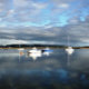 Uma vista noturna do porto de Aberdyfi depois de um dia de chuva o sol sai.