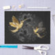 Joias pretas e douradas, beija-flores, sobre fundo de cinza decorado com plantas. Pássaros joalharia. Pássaro ouro. Pássaro Dourado.