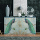 Versão do painel esquerdo e direito. "Peacock n Feather Pair Blue Dourado Decoupage Tissue Paper." Uma das pinturas mais amadas de Audrey Jeanne está disponível em papel tecidual para desligar! Este elegante e quente fundo azul empoeirado com um lindo pavão tem o trabalho de rolagem, penas de pavão e um fundo azul suavemente cinza. Pintado em pastel de petróleo por uma artista e designer internacionalmente licenciada, Audrey Jeanne Roberts, copyright.