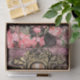 Um pavão elegante em uma moldura de pergaminho dourado acentuado com flores cor-de-rosa.
