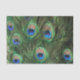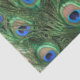 Penas verdes brilhantes de pavão com olhos brilhantes parecem incríveis neste papel tecidular. A fotografia brilhante faz uma bela design para as suas necessidades de doação. Foto fantástica para amantes de aves.