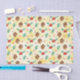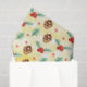 Papel tecidular com um padrão fofo que inclui cones de pínus e holly sobre fundo de aquarela amarela com pequenos círculos brancos espalhados por aí.