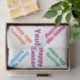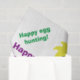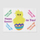 Tipografia da Páscoa festiva em texto verde, roxo, rosa, azul e laranja. Pintinho amarelo-abaulado eclodiu da sua casca listrada colorida em azul, roxo, verde, vermelho, amarelo contra fundo azul claro. Original © 2015 TamiraZDesines.