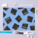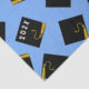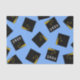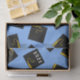 Presente criativo de formatura ou papel de seda decorativo para festa com características de boinas de formatura pretas e douradas em um fundo azul claro. Edite o texto para personalizar para o seu graduado favorito.