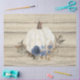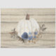 "Marinho de Abóbora Azul Escuro Floral Ephemera Rústica Papel Tecido de Descolagem de Madeira, peso pesado para desacoplamento de móveis, arte de parede ou embrulho de presente." Este é um layout design horizontal de uma abóbora branca com ardósias flores azuis e marinhos e folhagem de outono colorida à terra sobre um fundo de conselho de madeira revalorizado, pintado e pintado de forma rústica e clara, que também tem epemera de escrita manual e foi pintado em aquarela pela artista e designer internacionalmente licenciada, Audrey Jeanne Roberts, copyright.