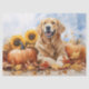 Arte aquarela de um cão recuperador de ouros com girassóis, folhas de outono e abóboras.