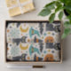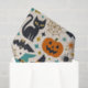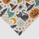 A fun, retro-inspired Halloween pattern with a bold mid-century modern vibe. Graphic black cats with glowing yellow eyes, smiling jack-o’-lanterns, playful bats, witches’ hats, crescent moons, spiders, and spiderwebs are scattered in a lively, balanced layout. The warm cream background and punchy color palette of pumpkin orange, teal, mustard, olive, and deep black evoke 1950s–1960s design with a festive, upbeat spirit. Whimsical starbursts and geometric accents add energy, making the pattern feel celebratory rather than spooky.